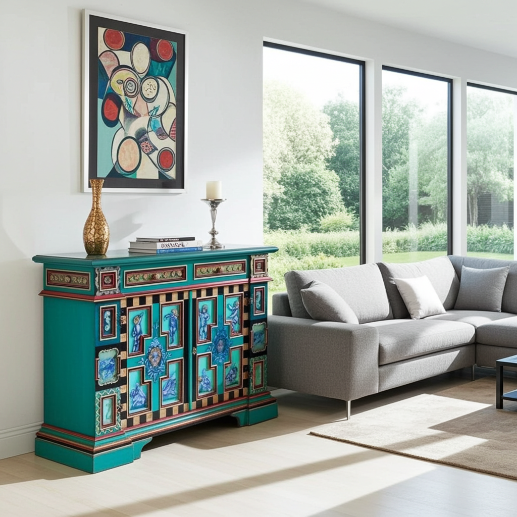 - Descrizione: Sorprendente credenza di gusto seicentesco e sfondo verde intenso. Il mobile è scandito da riquadri geometrici sulle due ante frontali. Due cassetti sovrastano le porte sotto il piano. La decorazione decisa e importante sottolinea le scelte geometriche con una cornice in oro e nero per sottolineare ed evidenziare le cornici del mobile stesso.