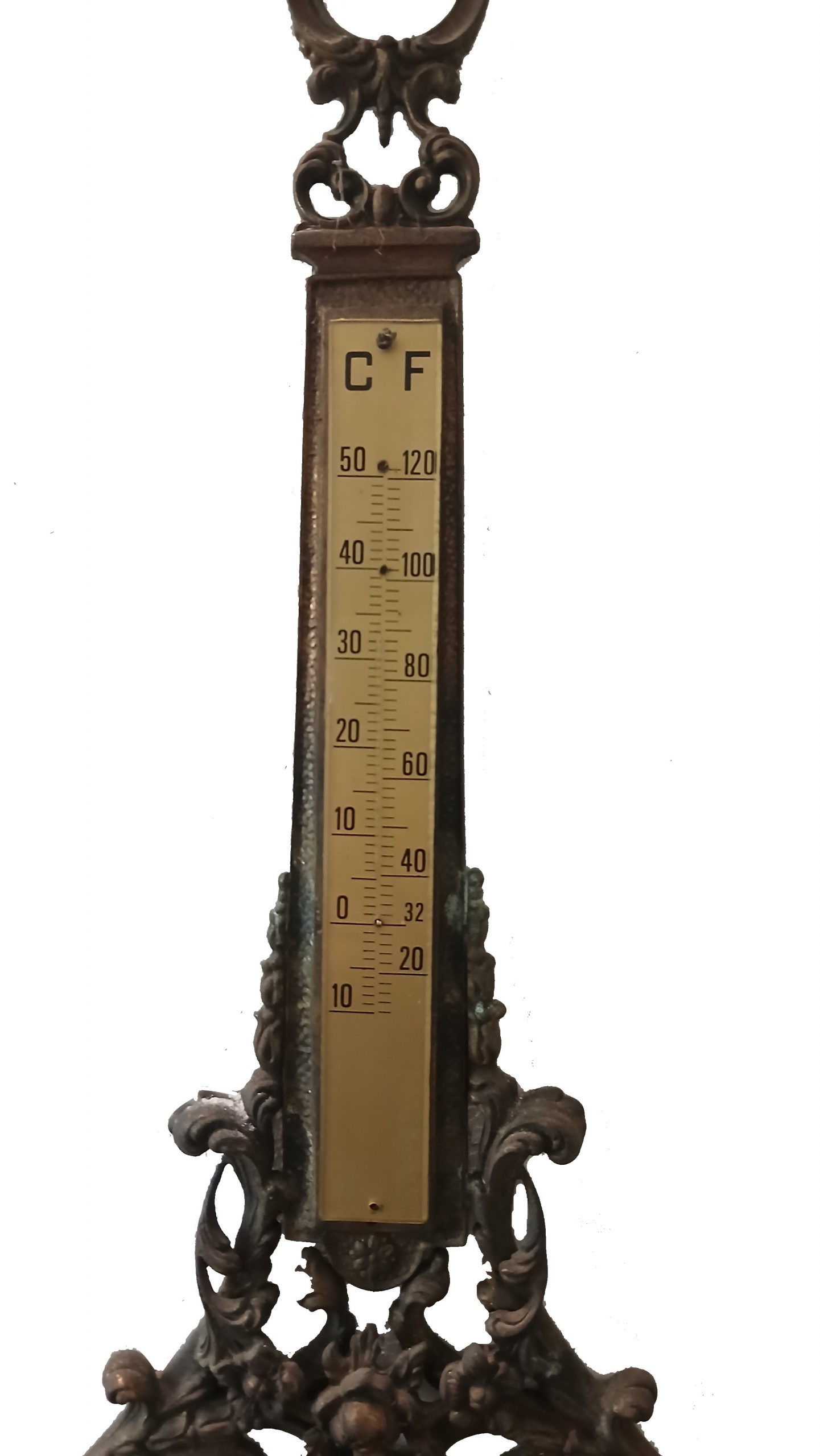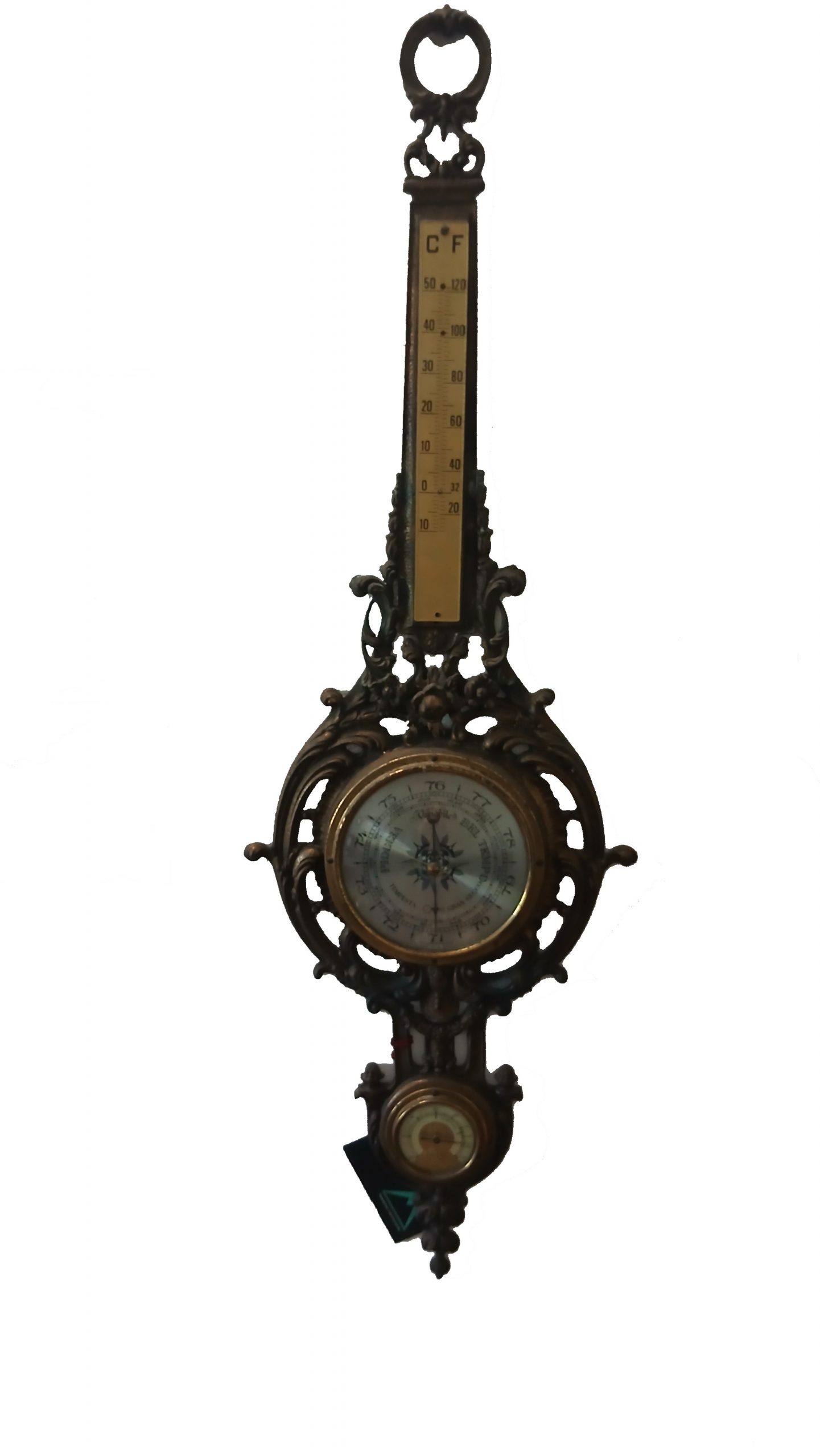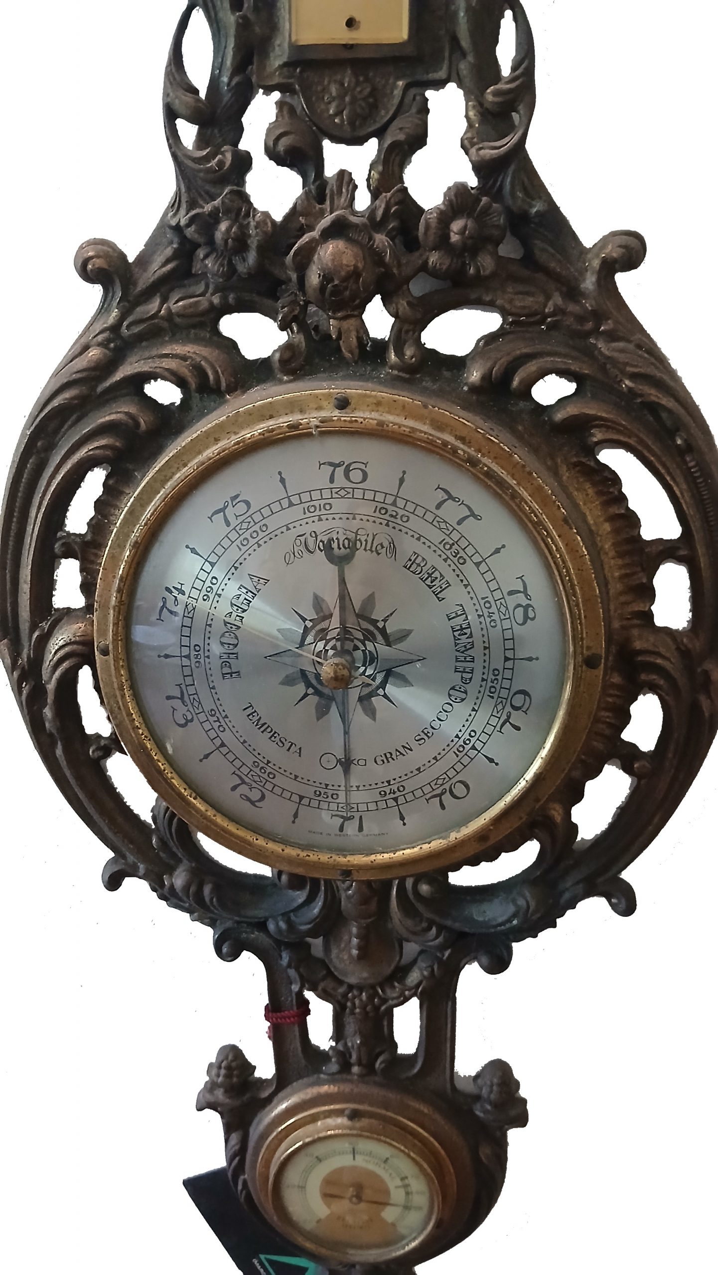 - Descrizione: Antico barometro vintage da parete, segna la temperatura, la qualità dell’aria e gli eventi atmosferici; la cassa è in metallo decorata con motivi floreali. Perfetto per chi ama l’estetica classica e desidera un complemento d’arredo che sia anche utile nella vita quotidiana. Affascinante barometro antico privo di mercurio, oggetto d’epoca dal forte valore storico e decorativo. Lo strumento necessita di restauro, offrendo un’interessante opportunità per collezionisti, restauratori o appassionati di strumenti scientifici antichi. Proposto nello stato di conservazione attuale.