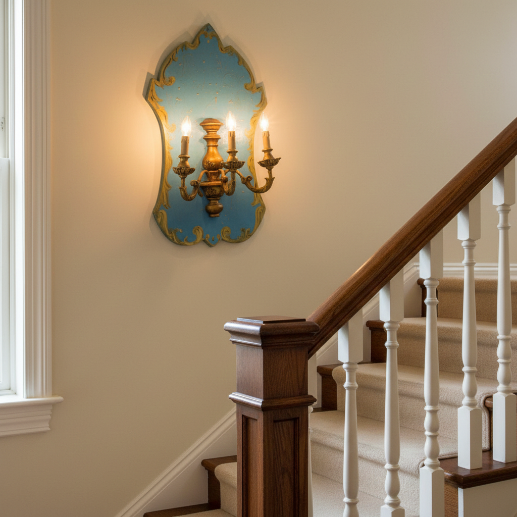 - Descrizione: Magnifica applique vintage a tre luci, realizzata interamente in legno intagliato e dorato a mano, espressione autentica dell’artigianato d’epoca più raffinato. Le tre braccia si aprono con armoniosa eleganza come rami fioriti, sostenendo altrettante luci a forma di candela, che evocano il fascino senza tempo dell’illuminazione classica. L’applique poggia su un sontuoso pannello in legno, anch’esso finemente intagliato, sagomato con la forma di uno scudo barocco dai profili mossi e sinuosi. Ogni dettaglio rivela la maestria dell’artigiano: le leggere sfumature del colore, le foglie stilizzate che si rincorrono lungo i bracci, le volute e i motivi floreali che conferiscono alla composizione un equilibrio perfetto tra opulenza e grazie.