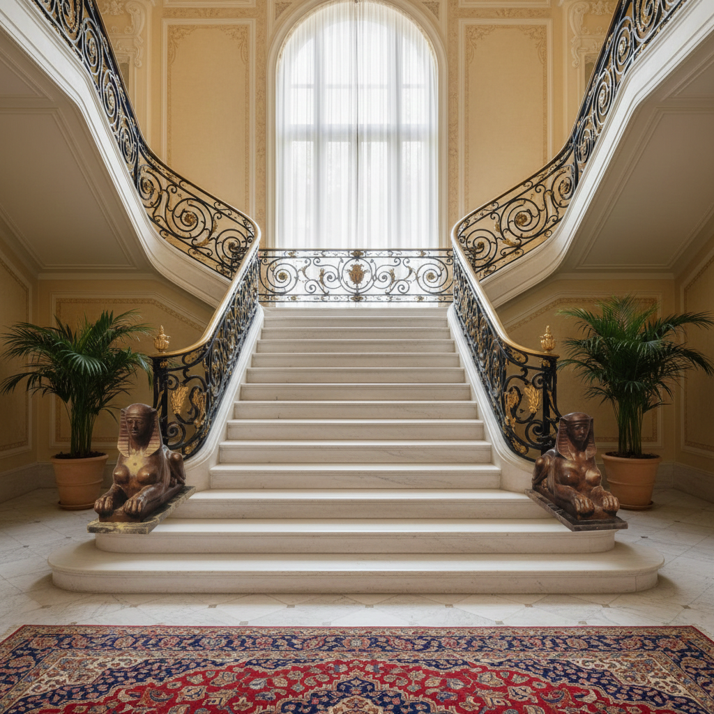 - Descrizione: Le sfingi sono raffigurate secondo la tradizione classica, con un corpo di leone accovacciato e volto femminile idealizzato, dai tratti eleganti e simmetrici. Le teste sono ornate da copricapi e le zampe anteriori distese, artigliate, denotano forza e maestosità. Le sfingi simboleggiano sapienza, mistero e protezione. L’uso nel XIX secolo riflette il gusto per l’esotismo e l’egittomania, molto in voga dopo le campagne napoleoniche in Egitto. La loro forma mitologica unisce l’elemento animale con quello romano adattandosi perfettamente al gusto dell’epoca per l’antico, l’allegorico e il misterioso.