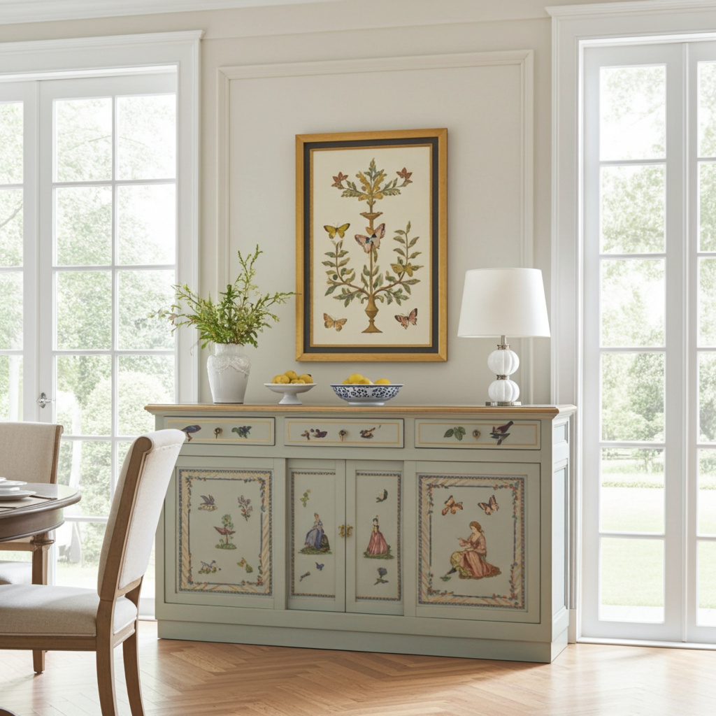 - Descrizione: Credenza artigianale in legno rifinita con cornici in foglia oro. Il mobile si distingue per la delicata tonalità panna, che ne esalta le forme armoniose e la preziosa decorazione. L’intera superficie è ornata da eleganti cornci in foglia oro, lavorate e cesellate, che donano luce e profondità all’insieme. Le ante scorrevoli e i tre ampi cassetti si aprono in uno spazio interno funzionale, suddiviso da due ripiani ideali per riporre stoviglie, cristallerie o biancheria. Tuttavia, la vera protagonista di questa credenza è la sua ricca decorazione artistica, un tributo alla poesia della natura. Sulle superfici si dispiega un raffinato ciclo pittorico che ritrae damine e gentiluomini in eleganti abiti del XVIII secolo, colti in scene di caccia e svago campestre, il tutto incorniciato da motivi floreali, frutti e farfalle che sembrano librarsi sulle superfici.