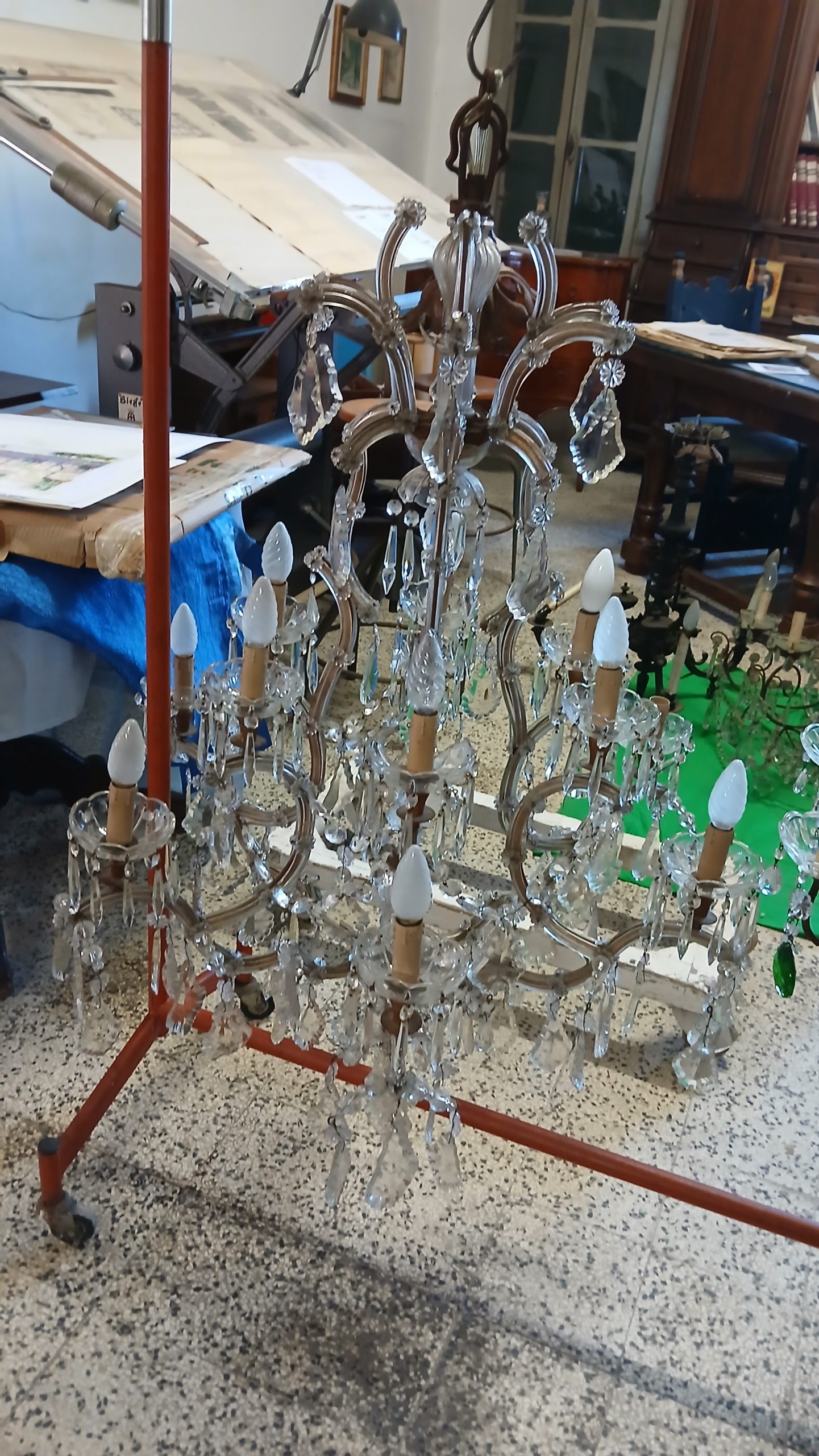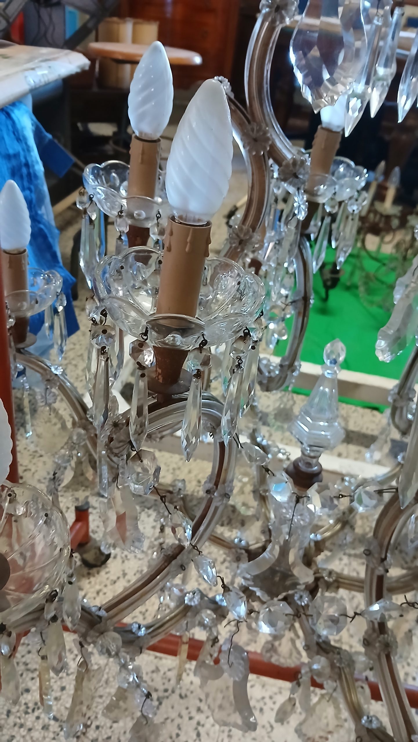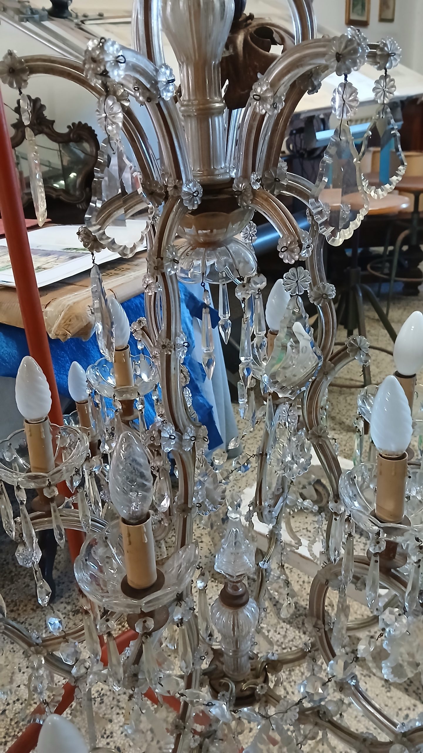 - Epoca e tecnica di produzione: L’epoca è a cavallo tra la prima metà e la seconda metà del XX secolo. Costruito interamente a mano con gocce di cristallo di varie grandezze, in ottimo stato.