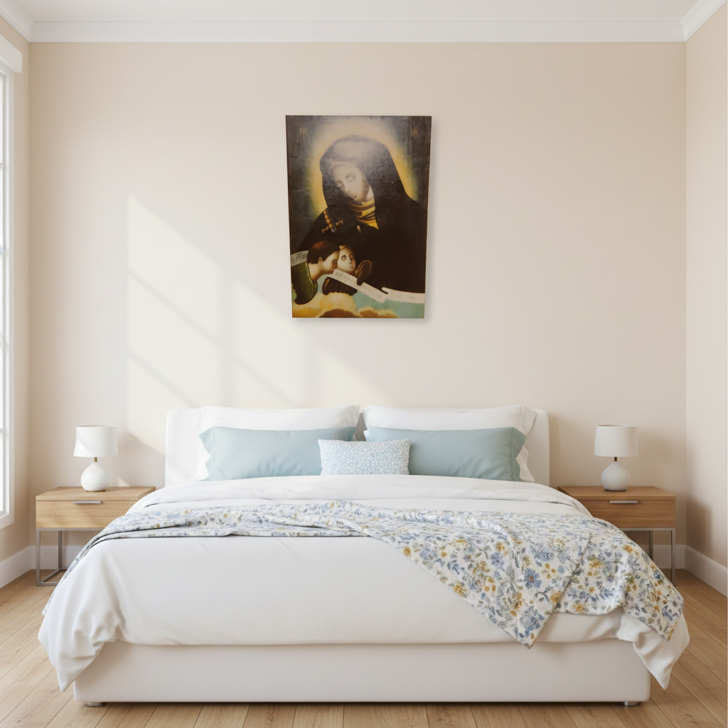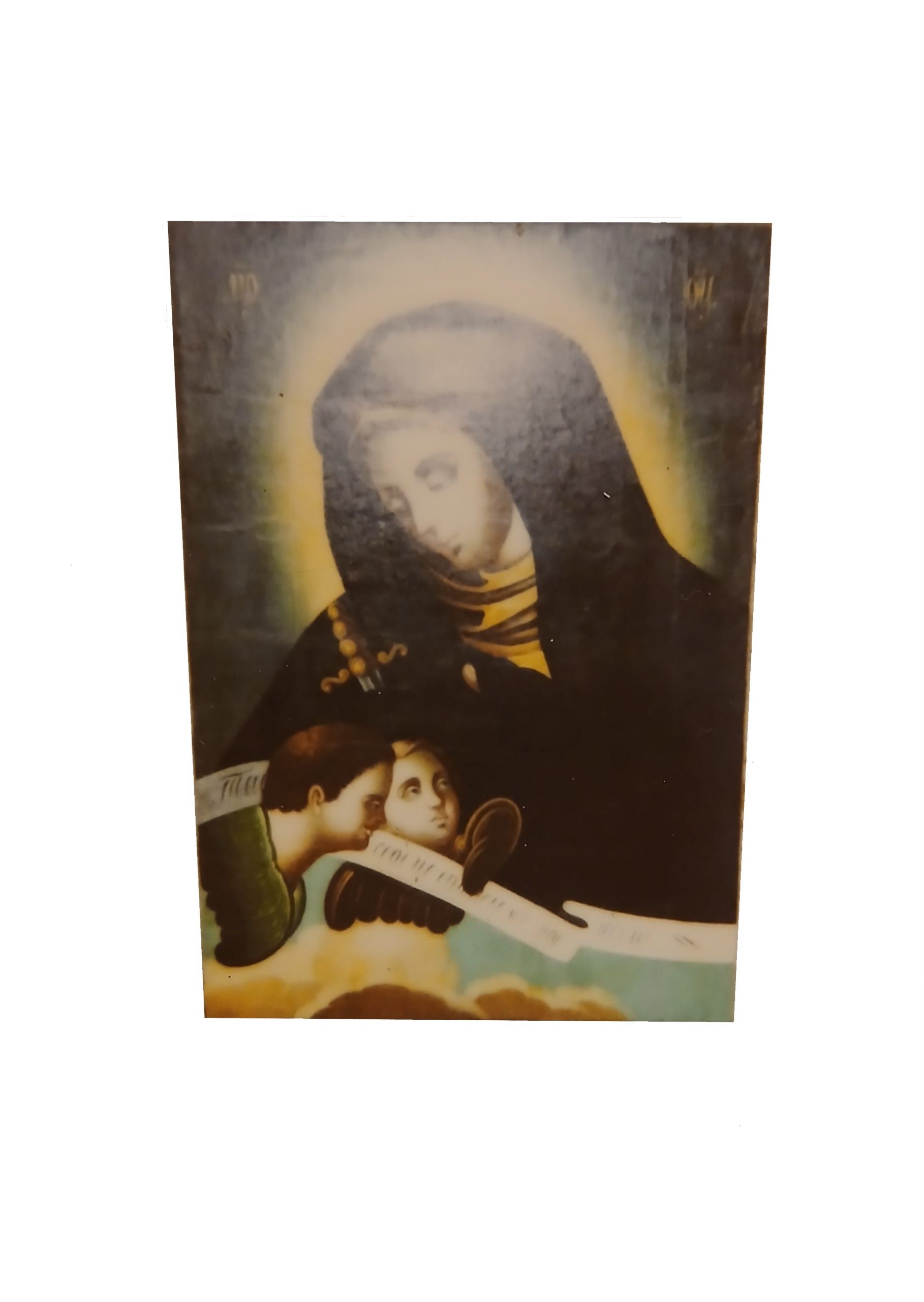 - Descrizione: Icona russa antica, su uno sfondo scuro è raffigurata la Madonna nell’atto di guardare una spada avvolta nel suo stesso mantello. In basso due piccoli putti sorreggono un cartiglio. L’iconografia si riferisce ai dolori affrontati da Maria, in questo caso richiamati da una sola spada riferibile ai dolori del mondo.
