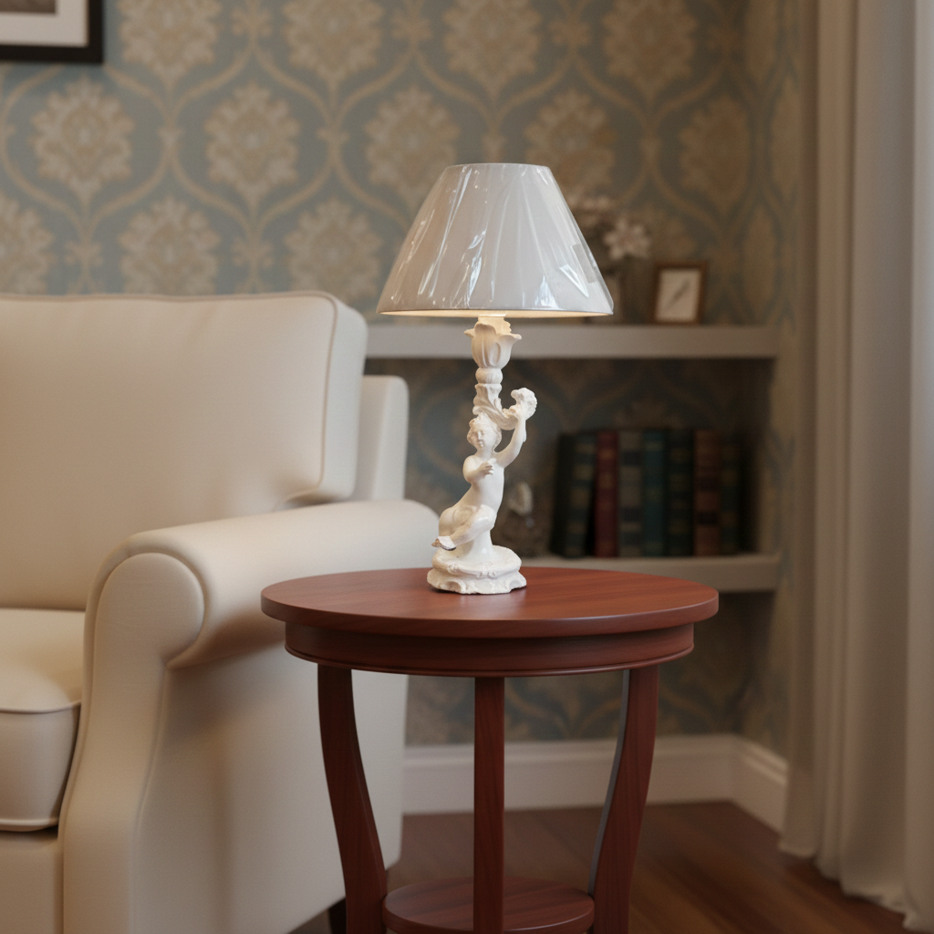 - Descrizione:Lampada vintage da tavolo vintage, è un esempio di gusto decorativo artigianale del Novecento. La base presenta una statuetta finemente realizzata raffigurante un putto, reso con dolcezza e precisione nei tratti, nell’espressione e nelle pieghe del corpo. Il piccolo putto, dal portamento aggraziato e leggero, sostiene una cornacchia che funge da originale e scenografico supporto per il corpo illuminante della lampada. La composizione unisce il candore e la purezza della ceramica smaltata alla forza della figura alata, creando un equilibrio tra innocenza e mistero. Il paralume è realizzato in tessuto di qualità, scelto per integrarsi al gusto originale del manufatto.