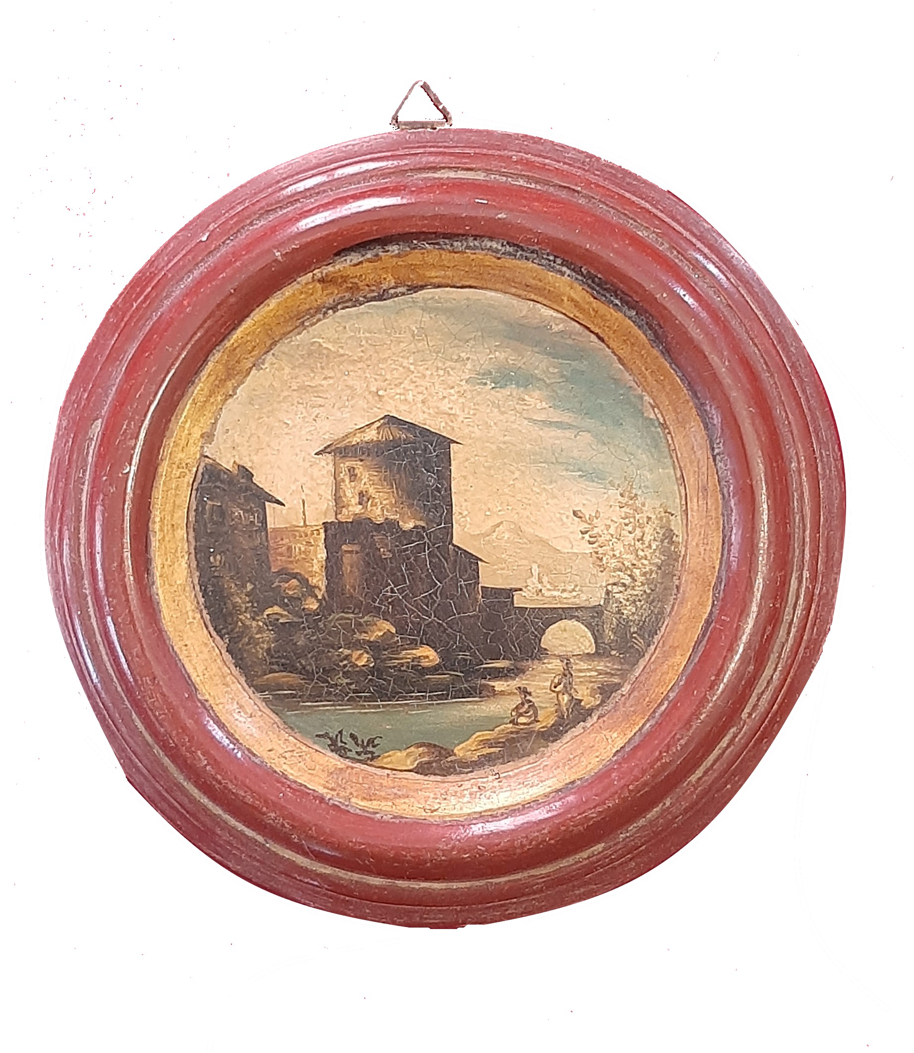 - Colore: Il paesaggio campestre è racchiuso in una cornice dipinta in oro zecchino su bolo armeno, una terra “argilla” rossa che permette una doratura omogenea e sfavillante.