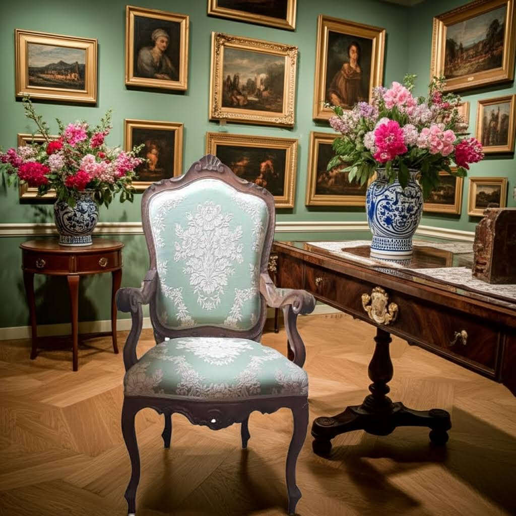 - Descrizione: Questa magnifica poltrona da studio o da scrivania in stile Luigi XVI incarna con assoluta grazia l’eleganza formale del tardo Settecento, reinterpretata attraverso una lavorazione artigianale di straordinaria cura. La struttura in legno massello presenta gambe affusolate e mosse, finemente scolpite con motivi classici che richiamano la purezza dello stile neoclassico. I braccioli, anch’essi modellati con delicate curvature, accompagnano la seduta con un profilo raffinato che unisce bellezza e funzionalità. Lo schienale sagomato, dalla dolce curvatura, accoglie lo schienale con gentilezza, garantendo una postura confortevole senza rinunciare all’estetica distintiva del periodo Luigi XVI.
