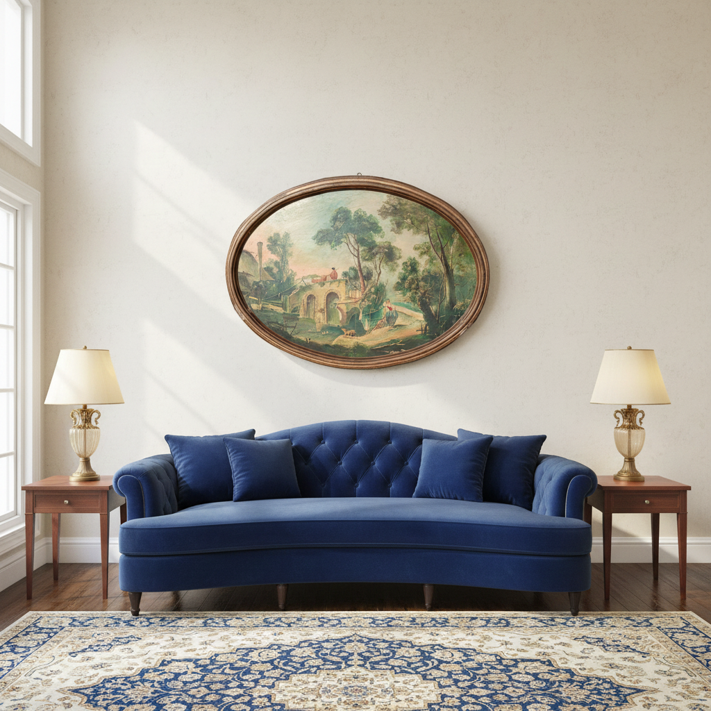 - La pennellata è morbida e fluida, caratterizzata da colori caldi e delicati. La forma ovale, tipica delle opere decorative da salotto, accentua l’eleganza della scena, rendendola ideale per ambienti classici, romantici o shabby chic.