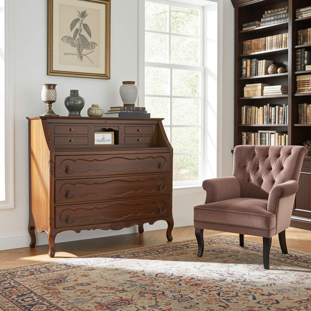 - Descrizione: Raffinata ribalta d’epoca si presenta con linee armoniose e proporzioni impeccabili, rivelando fin dal primo sguardo l’eleganza sobria della grande tradizione artigianale. La struttura è articolata in modo classico: nella parte superiore si trova lo sportello apribile, la caratteristica anta a ribalta che, una volta abbassata, si trasforma in un pratico piano di scrittura. La superficie dello sportello appare levigata con cura e custodisce al suo interno piccoli scomparti ideati per riporre corrispondenza, documenti e oggetti preziosi. Sotto la riblta si dispongono con ordine tre cassetti capienti, elegantemente allineati, ognuno di essi scorre con dolcezza, rivelando un interno ben conservato e adatto a contenere tessuti, biancheria o effetti personali. La ribalta unisce così utilità e bellezza: da un lato l’ampio piano di lavoro, dall’altro una notevole capacità contenitiva.