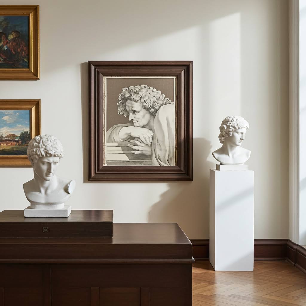 Stampa artistica di alta qualità raffigurante Raffaello Sanzio, tratta dal celebre affresco Scuola di Atene. - L’immagine ritrae l’artista all’interno della composizione originale, dove si autorappresenta tra filosofi e intellettuali dell’antichità. Il volto, dallo sguardo diretto e sereno, è reso con grande precisione nei dettagli e nelle sfumature chiaroscurali, conferendo profondità e realismo.