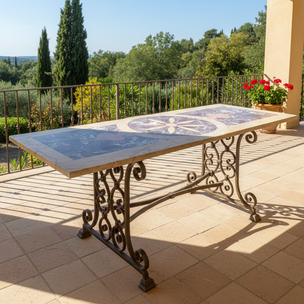 - Descrizione: Tavolo vintage rettangolare in marmo si presenta come un pezzo d’arredo capace di coniugare eleganza materica e ricercatezza artistica. La superficie in marmo rivela un imponente solidità, mentre la naturalezza delle sue venature crea un gioco armonioso di contrasti e sfumature. Il nero del tavolo è dato dal marmo nero di Ashford che veniva estratto dalle miniere vicino ad Ashford-in-the-water, nel Derby shire, in Inghilterra. Il nero si Ashford è una roccia sedimentaria a grana fine, può essere tagliato e intarsiato con altre pietre decorative e minerali infatti, in questo tavolo notiamo, all’interno del nero, delle striature bianche. La fascia è in marmo giallo Portogallo e gli intarsi in marmo rosso di Verona.