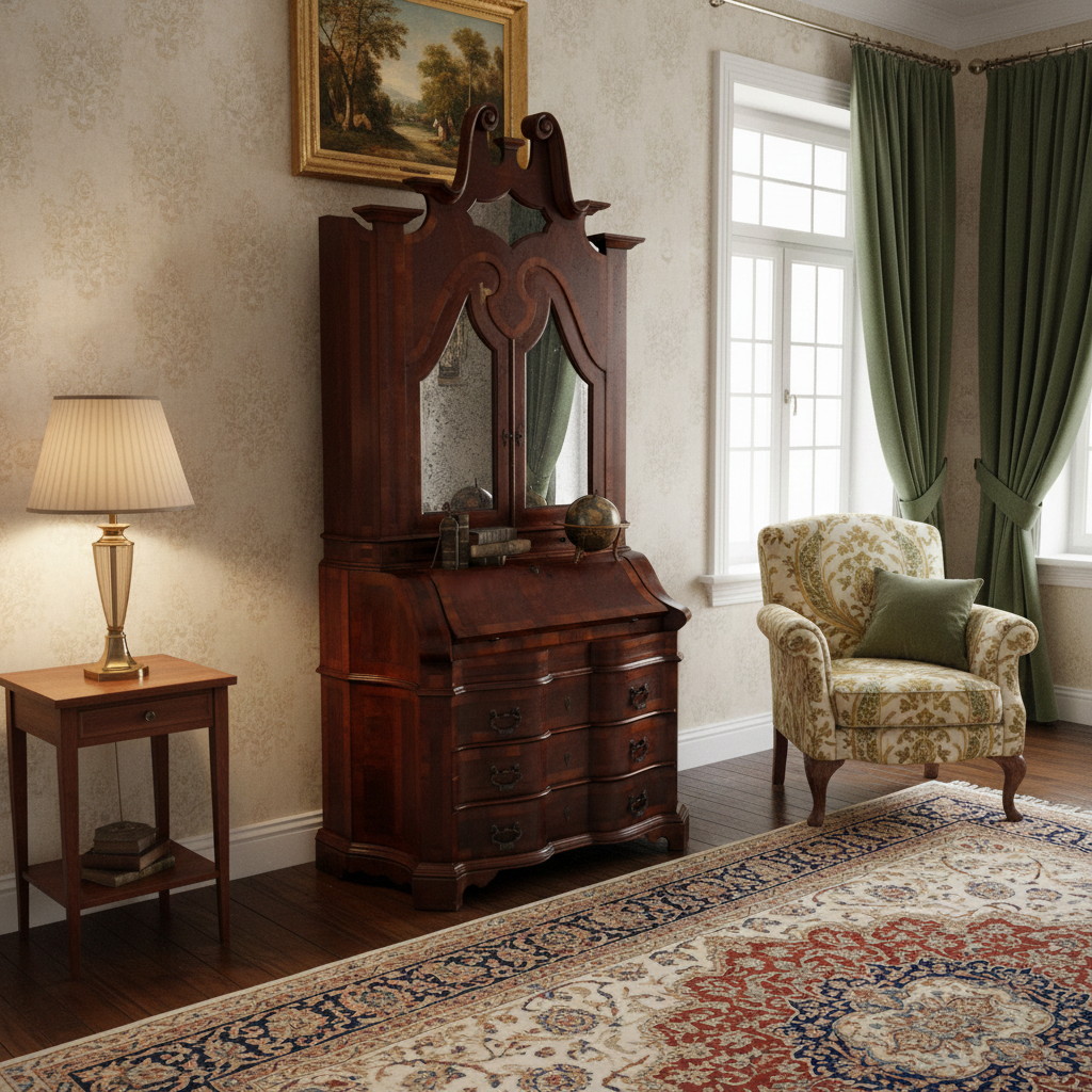 - La parte superiore, finemente lavorata, è arricchita da un piccolo specchio centrale originale d’epoca, che dona luce e profondità alla composizione. L’alzata presenta due ante specchiate, con profili sagomati, che si aprono su un vano interno suddiviso in scomparti.