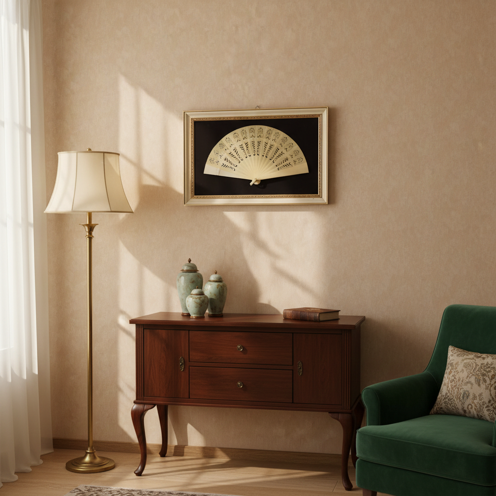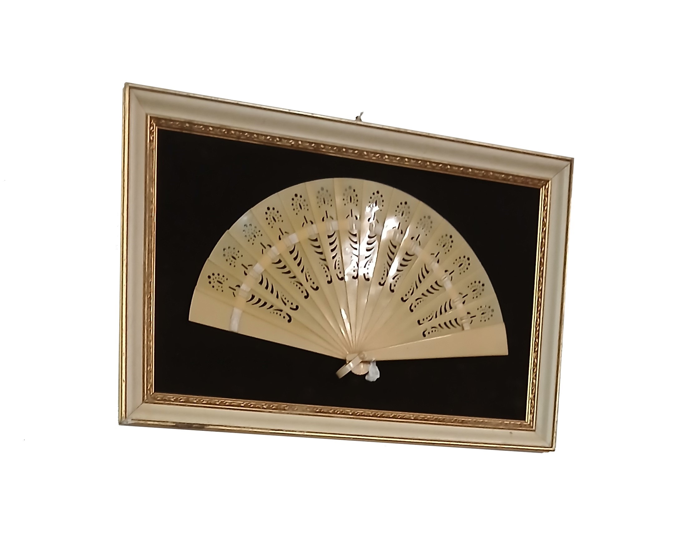 - Descrizione: Raffinato ventaglio vintage dei primi del ‘900, custodito in una teca priva di vetro, con cornice liscia dal profilo sobrio ed elegante. L’oggetto è delicatamente adagiato su una base di velluto scuro, che ne mette in risalto le linee armoniose e la finezza dei dettagli decorativi. Le stecche, perfettamente raccordate da un anello centrale, sono impreziosite da un elaborato decoro geometrico e floreale traforato, realizzato con notevole maestria artigianale. L’equilibrio tra elementi ornamentali e intagli traforati dona al ventaglio un’eleganza leggera e sofisticata, tipica delle creazioni d’epoca. In buono stato complessivo, con lievi segni del tempo coerenti con l’età dell’oggetto. Le stecche conservano la loro forma originale e i trafori sono nitidi e ben leggibili.